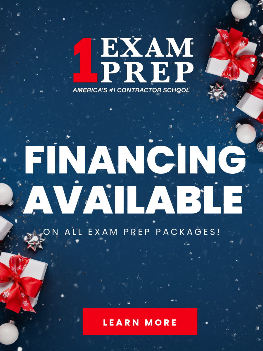 1 Exam Prep is your go-to resource for navigating and succeeding in your career as a contractor. Weāre the most effective and efficient contractor exam preparation school in the industry. With contractor courses, tabbed textbooks, and online tutoring, we help you pass your contractor exams the easy way at the lowest prices in the industry.
