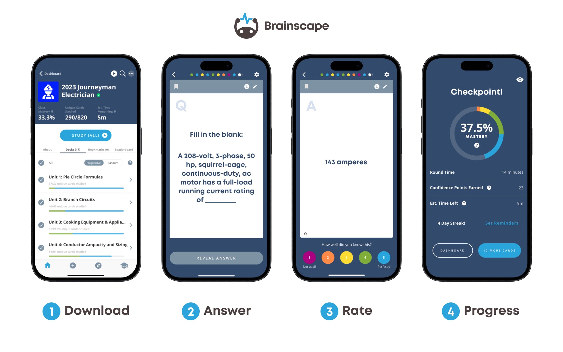 Brainscape’s study algorithm is deeply rooted in cognitive science research to empower you to learn as fast and as painlessly as humanly possible. The web and mobile app fit seamlessly into even the busiest of work schedules, offering you a powerful and convenient study tool you can use anytime, anywhere to learn and retain everything you need to know to crush the 2023 Journeyman Electrician exam!