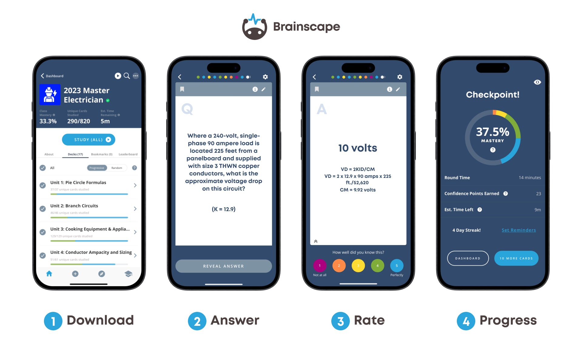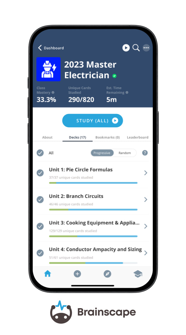Brainscape’s study algorithm is deeply rooted in cognitive science research to empower you to learn as fast and as painlessly as humanly possible. The web and mobile app fit seamlessly into even the busiest of work schedules, offering you a powerful and convenient study tool you can use anytime, anywhere to learn and retain everything you need to know to crush the 2023 Master Electrician exam!