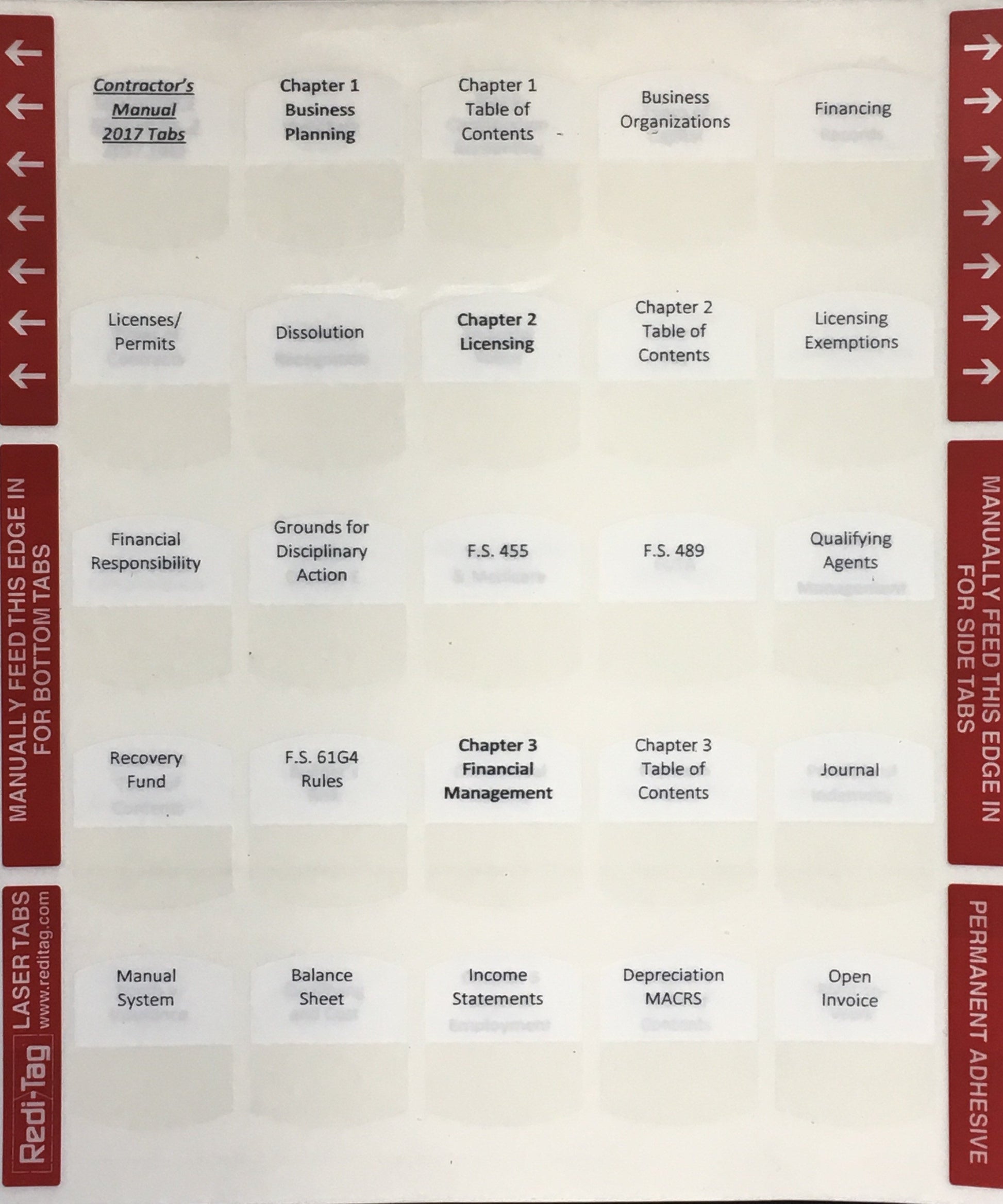 Fichas preimpresas para el paquete de libros para contratistas generales certificados por el estado de Florida; Solo pestañas (los aspectos más destacadosno están incluidos)