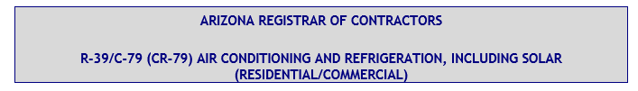 C-79 Aire acondicionado y refrigeración, incluido el solar Alcance – Instalación, alteración y reparación de sistemas de refrigeración y enfriamiento evaporativo, incluido el solar. Instalación, alteración y reparación de sistemas de calefacción de tipo “húmedo”, “seco” o radiante. Los sistemas "húmedos" incluyen calderas y serpentines de vapor o agua caliente, o convertidores de placa base y están limitados a una presión operativa de 30 PSIG de 220 °F para agua caliente y una presión operativa de 15 PSIG para vapor. Los sistemas "secos" incluyen calderas y calentadores de gas. Instalación, alteración y reparación de sistemas de ventilación. La instalación de estos sistemas incluye conductos, dispositivos de filtrado de aire, dispositivos de tratamiento de agua, controles neumáticos o eléctricos y tuberías de control. Aislamientos térmicos y acústicos, materiales y dispositivos de aislamiento de vibraciones, tuberías y tanques de combustibles líquidos, y tuberías de agua y gas desde la conexión del servicio hasta los equipos a los que da servicio. Pruebas y balanceo de circuitos de refrigeración, calefacción y refrigeración, y sistemas de tratamiento de aire.