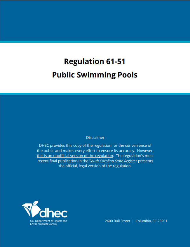 El Reglamento 61-51 de Carolina del Sur se promulgó para proteger la salud y la seguridad públicas en las piscinas públicas. El reglamento es un recurso útil para los contratistas de piscinas y los operadores de piscinas certificados. 65 páginas.