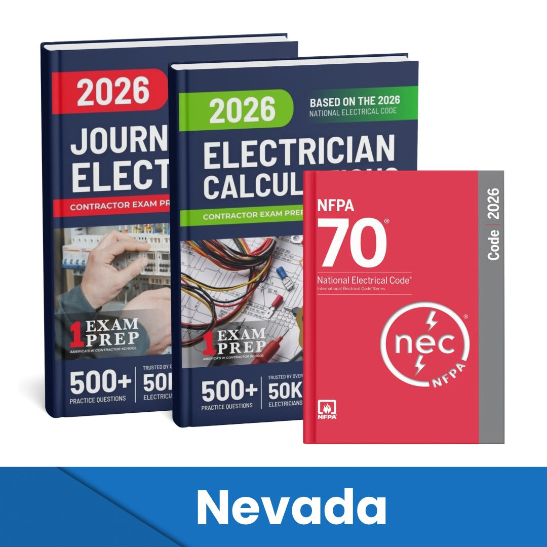 The 2026 Nevada Journeyman Electrician & Electrician Calculations Study Guides & National Electrical Code Combo (Based on the 2026 NEC) from 1 Exam Prep provides a comprehensive reference for candidates pursuing the Nevada Journeyman Electrician License under state and local regulatory boards. This set includes the latest 2026 National Electrical Code (NEC), official by the NFPA. The companion study guide focuses on code calculations, grounding, bonding, conductor sizing, load computation, and motor control—aligning with exam requirements from PSI and Prometric testing vendors. Designed to prepare electricians for trade knowledge and safety standards, this combination ensures compliance with the most current NEC updates while supporting both classroom and self-paced electrical exam preparation through 1 Exam Prep’s contractor education platform.