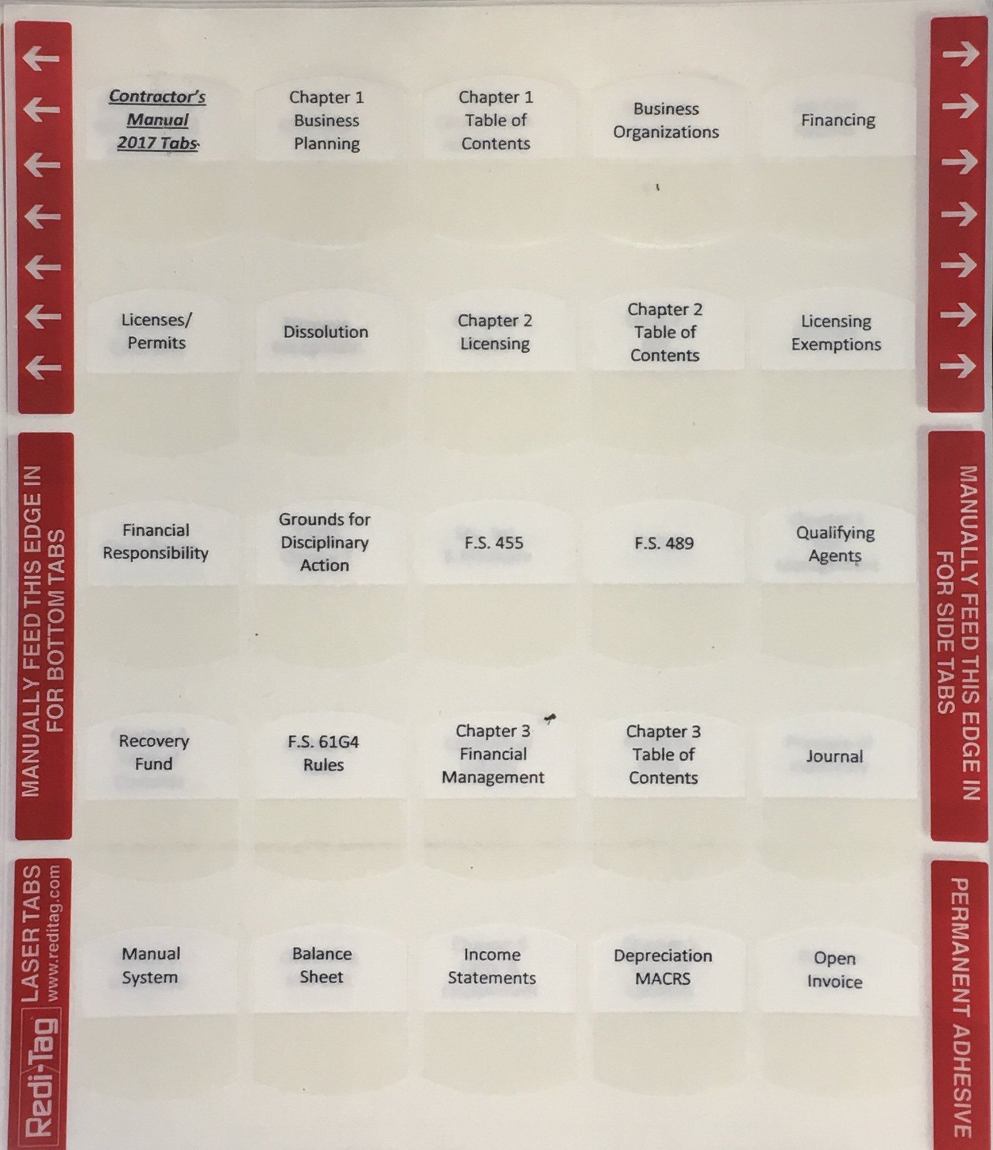 The Florida Contractors Manual, 2021 Pre-Printed Tabs by 1 Exam Prep are designed to assist candidates preparing for Florida Construction Industry Licensing Board (CILB) contractor licensing exams. These durable, color-coded adhesive tabs correspond to key sections of the 2021 Florida Contractors Manual, the official reference for all state construction contractor examinations. Each tab is pre-labeled to identify important topics such as business organization, financial management, lien law, workers’ compensation, safety regulations, and contract administration. The tabs are approved for use during open-book portions of the CILB exams and help examinees quickly locate critical information within the manual. Created for construction contractors pursuing state certification or registration, these pre-printed tabs improve exam-day efficiency and compliance with Florida DBPR testing requirements.