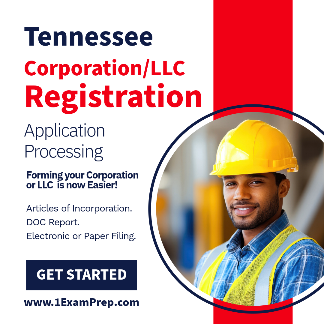 The Tennessee Corporation or LLC Filing Registration Setup from 1 Exam Prep assists contractors in forming and registering a legal business entity through the Tennessee Secretary of State as part of the state’s contractor licensing process. This service supports applicants preparing to meet the Tennessee Board for Licensing Contractors’ requirements, including proper entity formation before submitting license or NASCLA-based exam applications. It provides step-by-step guidance for contractors in general building, electrical, mechanical, HVAC, and plumbing trades to ensure compliance with state regulations. By managing the filing and registration setup, 1 Exam Prep streamlines the first step toward obtaining a Tennessee contractor license.
