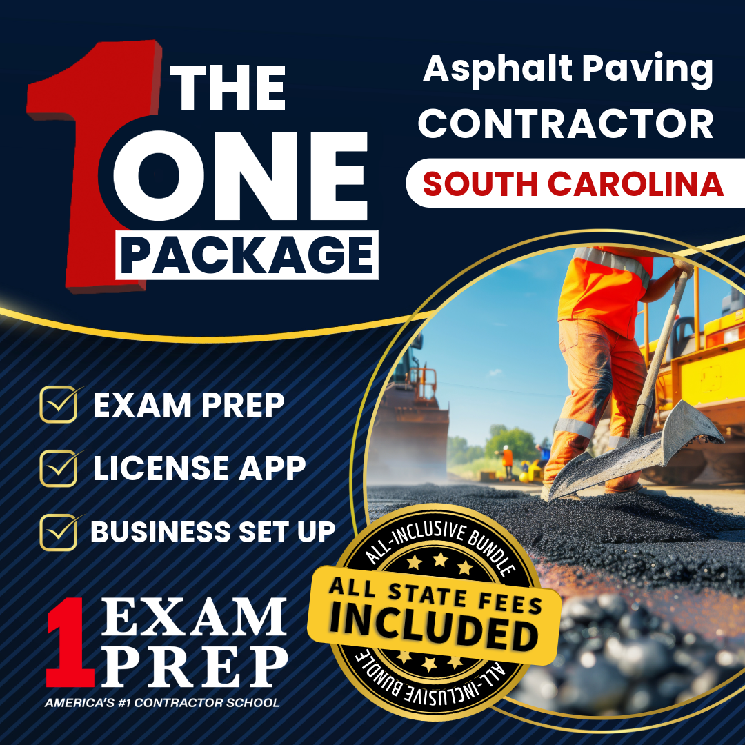 The 1 Package: All-Inclusive South Carolina Asphalt Paving Contractor Exam, Licensing & Business Setup Solution from 1 Exam Prep provides structured preparation aligned with the South Carolina Contractor’s Licensing Board requirements for asphalt paving professionals. This program encompasses the NASCLA Business and Law exam and the technical trade examination covering asphalt composition, surface grading, paving equipment operation, compaction procedures, and roadway safety standards. It includes reference books, code materials, and practical exam strategies designed for state-approved certification. The course equips contractors with the knowledge necessary to meet licensing, documentation, and compliance standards for managing commercial asphalt paving projects across South Carolina.