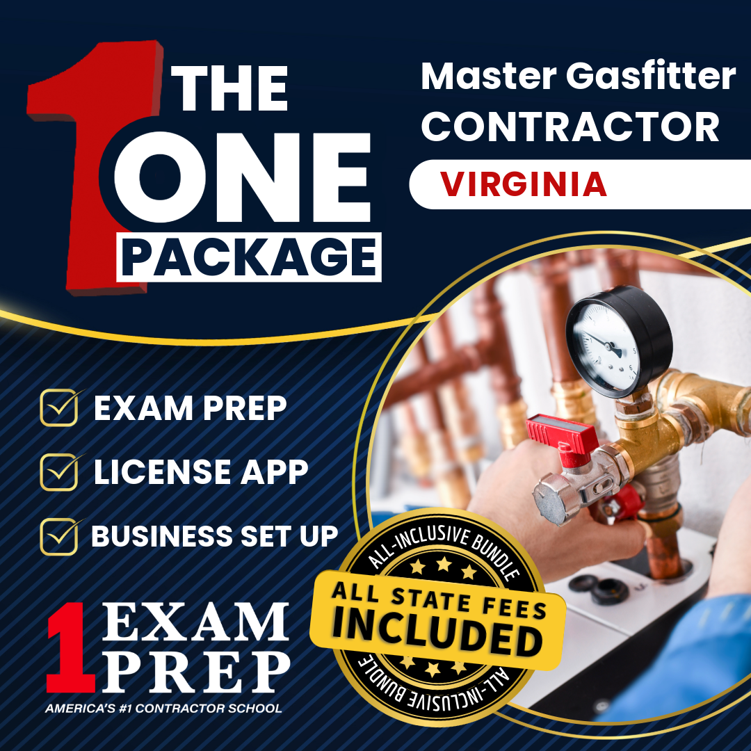 The 1 Package: All-Inclusive Virginia Master Gasfitter Contractor Exam, Licensing & Business Setup Solution from 1 Exam Prep provides a complete preparation and licensing solution for candidates pursuing the Virginia Board for Contractors Master Gasfitter (GFC) classification. This program includes the required technical and business exam prep courses, study materials, and guided business setup assistance in accordance with Virginia Department of Professional and Occupational Regulation (DPOR) requirements. It covers gas piping systems, venting, combustion air, code compliance, and safety practices based on the International Fuel Gas Code (IFGC). Designed for contractor school participants and trade professionals, this all-in-one package streamlines exam readiness, licensing approval, and business establishment for Virginia Master Gasfitter contractors.