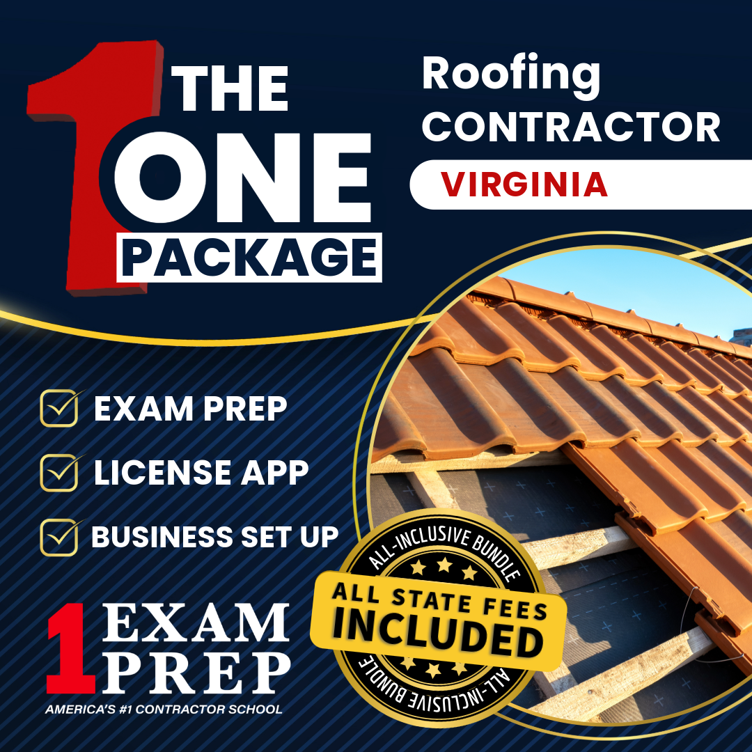The 1 Package: All-Inclusive Virginia Roofing Contractor Exam, Licensing & Business Setup Solution from 1 Exam Prep delivers a complete preparation and licensing pathway for individuals seeking the Virginia Board for Contractors Roofing (ROC) classification. This all-inclusive program features online business and technical exam prep courses, reference materials, and guided business setup support consistent with Virginia Department of Professional and Occupational Regulation (DPOR) standards. It covers roofing systems, waterproofing methods, material installation, safety requirements, and code compliance for residential and commercial projects. Ideal for contractor school students and trade professionals, this package simplifies exam preparation, state licensing, and company formation for Virginia roofing contractors.